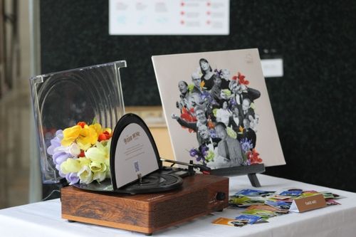 I designed invitations detailing the who, what, where, when, why, and how – with a mirror on the front for a personalized touch. I designed a menu for each sexuality – with collages of the LGBTQ+ figures I collected on the back and absurd menu titles on the front. I designed a small set of cards for each sexuality – with information about the LGBTQ+ figures from the collages on one side and prompting Q&A questions on the other. I designed a music station – with a sign made from an actual vinyl record and a curated playlist of jazz music created by queer artists.